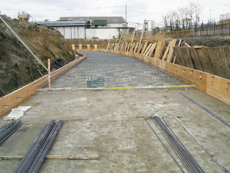 次に、堤防=道路よりおよそ1.6m下にある土地の底上げをしなければならなかった。堤防とフラットにすることにより、敷地の効率化は高まるが、当然にそれだけの土地を盛り土にする土の量と、それらを支える周囲三方の擁壁の施工工事が必要でした。